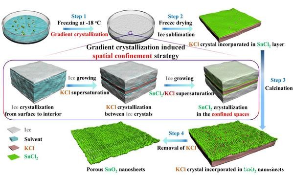 二维多孔金属氧化物纳米片(2DMONs)具有高的表面体积比、周期性的长程旋转和平移对称原子结构,在能源存储、催化、电子器件和化学传感器等领域的各种应用中引起了广泛的研究兴趣。然而,现有的2DMONs合成方法过程复杂苛刻,效率低,不利于实际应用,因此,开发一种通用、高效、经济的晶态2DMONs的合成方法具有重要意义。针对此问题,该团队开发出一种梯度结晶诱导空间限域法合成多孔金属氧化物纳米片,以冰和无机盐(KCl)为模板合成晶态多孔金属氧化物纳米片,包括SnO2, Fe2O3, NiO, Co3O4, CuO, ZnO, In2O3, CeO2,ZrO2和贵金属负载的Pt/SnO2;并将其应用于气体传感器领域中。制备的晶态2D多孔Pt/SnO2纳米片作为气体传感器对3-羟基-2-丁酮表现出了优越的传感性能(3-羟基-2-丁酮是检测单核细胞增生李斯特菌的生物标志物)。