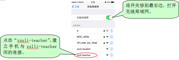 打开“WLAN”后,会出现一系列的网络连接列表(即无线SSID),找到并点击“zzuli-teacher”或“zzuli-student”,建立手机与学校无线网间的连接,如图11所示。