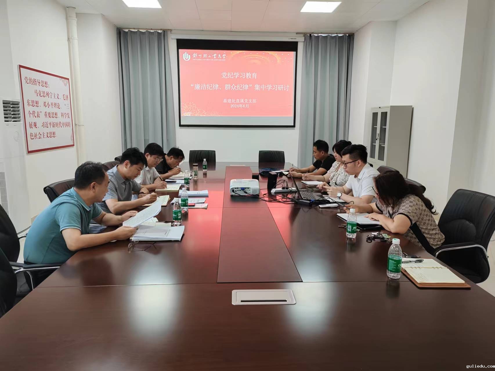 6月7日下午,基建处直属党支部召开党纪学习教育党委理论学习中心组学习会,围绕“廉洁纪律、群众纪律”开展专题学习,支部全体党员参加了会议,会议由支部书记王艳军主持。