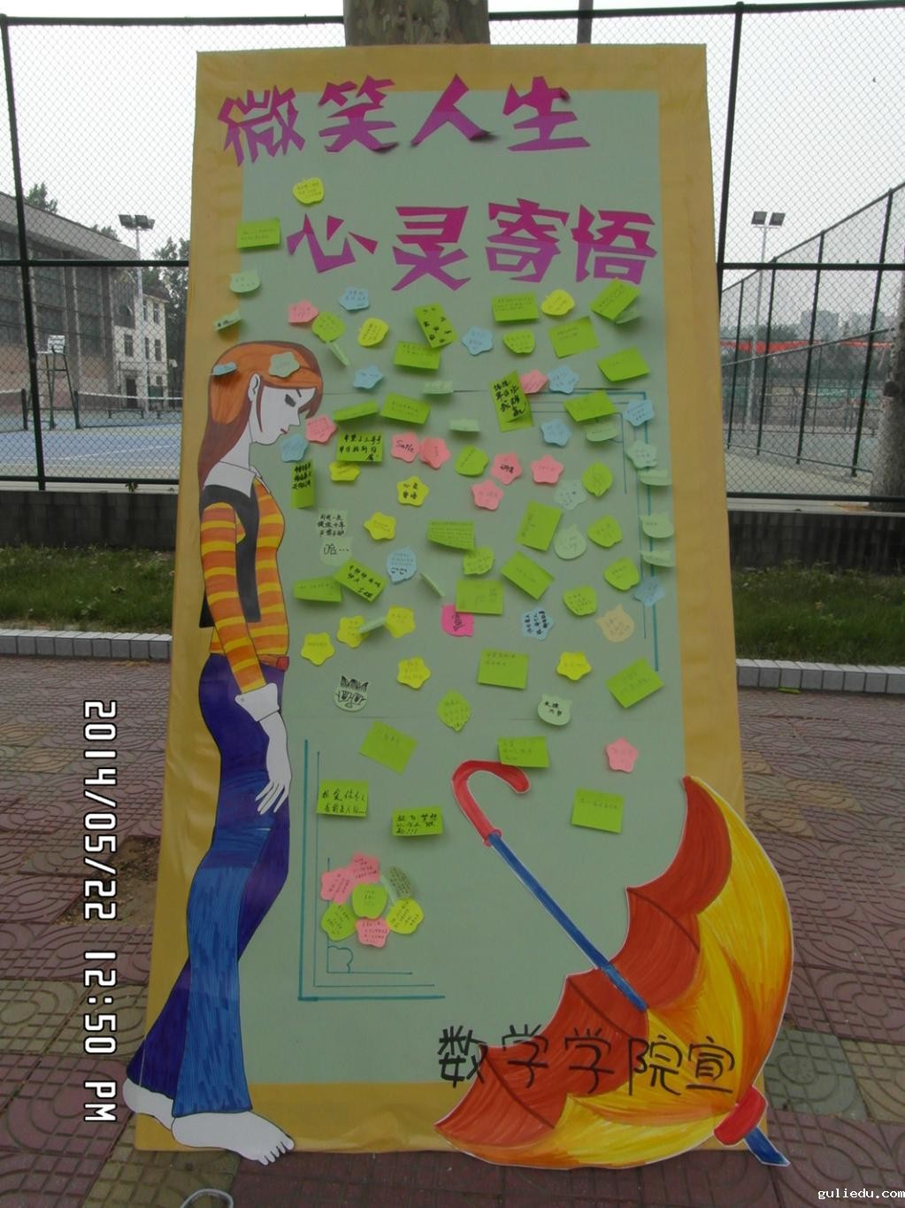 为引导同学们敞开心扉,笑对人生, 5月22日上午,数学与信息科学学院在东风校区主干道成功举办“微笑人生,心灵寄语”活动。 在活动过程中,广大同学积极参与,将自己对学习、对生活、对他人的真情实感以及对人生的感悟通过寄语板这个平台广播出去,并从这个平台上获得了心灵上的支持,得到了心灵的满足。从而也使活动达到了帮助同学们释放心灵,传递正能量目的。 本次活动促进了同学们之间的沟通和了解,同时为营造人人关注心理健康的校园氛围起到了积极推动作用。